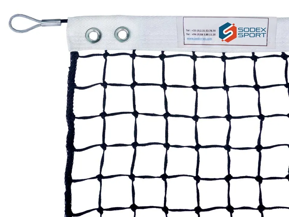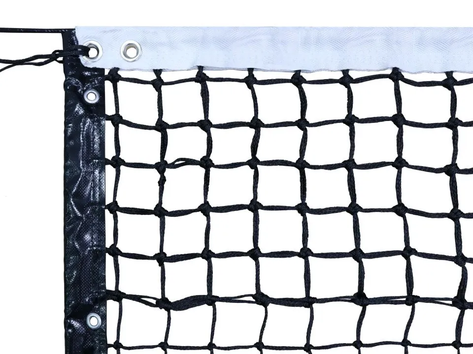 - Lưới tennis đen sợi HDPE BR Ø3.0mm được xử lý kháng UV, ô lưới đơn 45mm với 6 ô lưới trên ô đôi. Chiều dài lưới 12.7m với băng trên PES trắng viền băng PVC xung quanh, giao kèm với băng giữa và cọc lưới.
