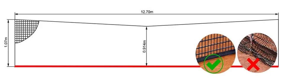 - Lưới tennis đen sợi HDPE BR Ø4.0mm được xử lý kháng UV, ô lưới đơn 48mm với 6 ô lưới trên ô đôi, không thụng giữa. Chiều dài lưới 12.7m với băng trên PES trắng viền băng PVC xung quanh, giao kèm với băng giữa và cọc lưới.